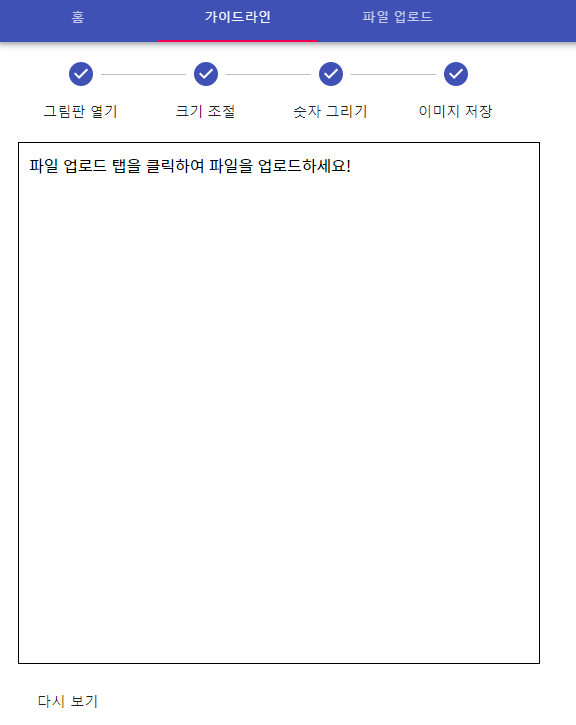 Guide.js에서는 숫자 판별 앱을 사용하는 방법을 설명한다. Home.js와 동일하게 value와 index값이 같은 경우만 내용을 보여준다. 단순히 내용을 보여주는 기능이지만 단계별로 설명하기 위해 material-ui의 Stepper 컴포넌트를 이용하였다.