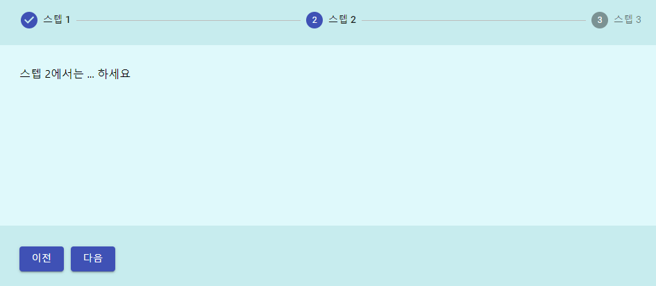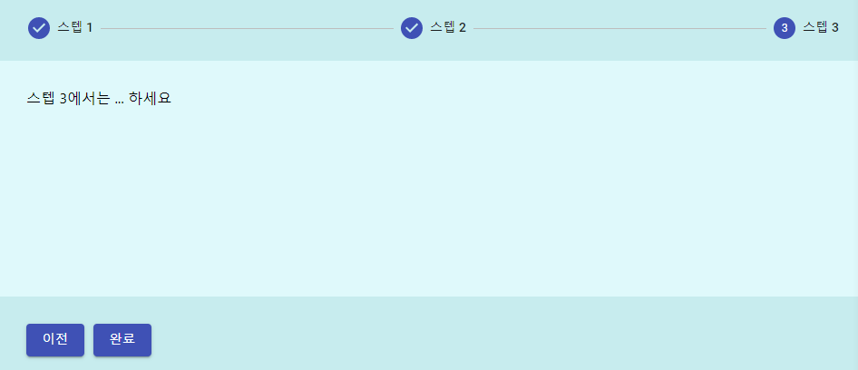 첫 번째 step에서는 다음 버튼만 활성화하며 다음 버튼을 클릭하면 다음 step으로 넘어간다. 그 이후에는 이전 버튼과 다음 버튼을 모두 활성화하며 이전 버튼을 클릭하면 이전 step으로 돌아간다. 마지막 step에서는 다음 버튼의 글자를 완료로 바꿔 보여준다. 완료 버튼을 클릭하면 모든 스텝이 종료되었을 때의 내용을 보여주며 다시 시작하기 버튼을 클릭하면 첫 번째 step으로 돌아간다.