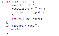 func라는 함수 내부에는 str이라는 변수와 funcClosure이라는 함수가 존재한다. funcClosure는 함수 scope에 존재하지 않는 str이라는 변수를 출력하는 함수이다. 이때 lexical scoping에 의해 funcClousre 함수는 'Hi'라는 문자열 출력하도록 선언할 때 결정된다. 이때 funcClousre 함수는 함수이면서 함수 scope에 존재하지 않는 변수에 접근이 가능하므로 closure가 된다.