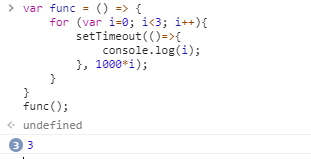 이 코드를 lexical scoping의 이해 없이 본다면 1초 간격으로 0, 1, 2를 차례로 출력하길 예상할 것이다. 하지만 결과를 보면 1초 간격으로 3을 출력하게된다. setTimeout 함수 scope에는 변수 i가 존재하지 않으며 lexcial scoping에의해 func 함수 내에 존재하는 변수 i를 출력하게 된다. 이때 for문이 끝나면 func 내의 i 변수는 3가 되고 setTimeout 함수에서 사용하는 i는 func 내의 변수 i이기 때문에 3을 출력하게 된다. 이를 해결하기 위해서는 for 문안에 변수 i에 대입된 값을 받아 setTimeout을 실행하는 함수를 정의하고 호출해야한다.