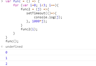 이 경우는 원래의 의도대로 1초 간격으로 0, 1, 2를 차례로 출력한다. func 안에서 func2를 호출하고 func2안에 i값을 인자로 전달하였다. 이때 setTimeout 함수의 인자로 전달되는 익명함수가 closure가 된다. 함수이면서도 변수 j가 함수 scope에 없으며 lexical scoping에 의해 func2 함수의 인자로 전달되는 j값을 사용하도록 선언할때 결정된다. 따라서 인자로 전달되는 j값인 0, 1, 2를 출력하게 된다.