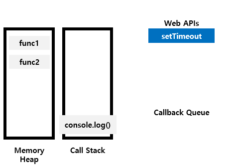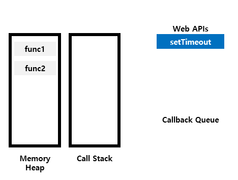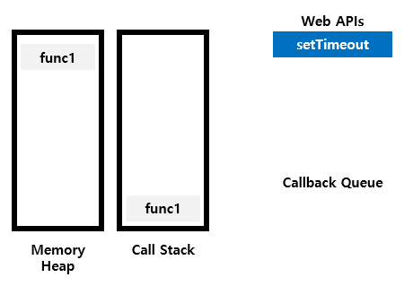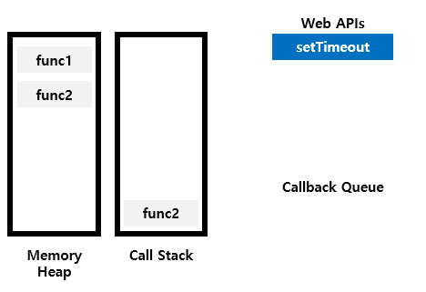 먼저 func1을 호출하므로 call stack에 쌓는다. func1에서 setTimeout이라는 web api를 실행하면 func1의 함수를 모두 처리하게 된다. 바로 func1을 call stack에서 없애고 다음 함수인 func2를 call stack에 쌓는다.