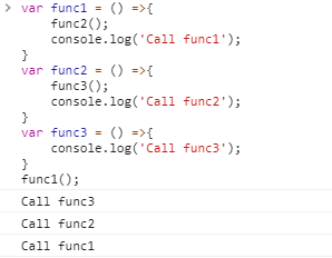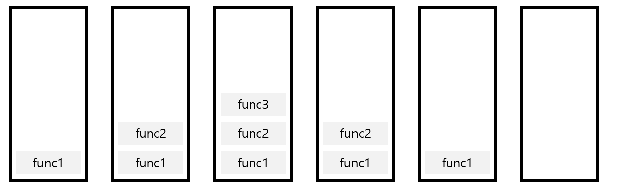 가장먼저 func1을 호출하므로 call stack에 func1이 쌓인다. 그리고 func1에서 func2를 호출하므로 call stack에 func2가 쌓이고, func2에서 func3을 호출하므로 call stack에 func3이 마지막으로 쌓인다. Call stack에서는 가장 위에 놓인 함수를 가장 먼저 처리하므로 Call func3을 가장 먼처 출력하고 차례로 Call func2, Call func1이 출력된다.