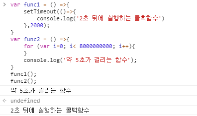 추가적으로 3초가 지나면 func2 함수내에서 약 5초정도 걸리는 작업을 마치고 console.log() 함수를 이용해서 '약 5초가 걸리는 함수'라는 문자열을 출력한다. 이후 func2 함수를 처리하였으므로 fubc2을 call stack에서 없애고 callback queue에 저장된 console.log() 함수를 call stack에 옮긴다.