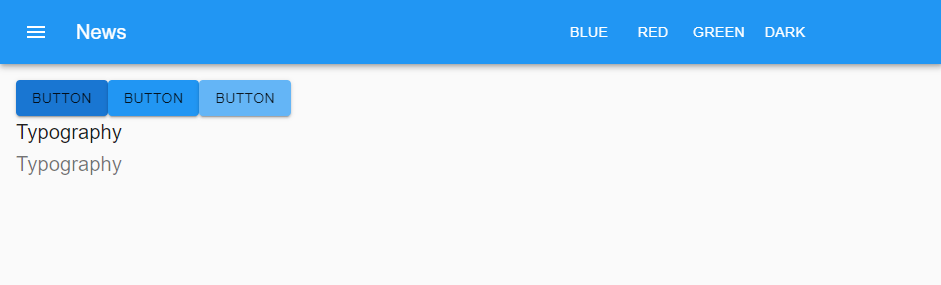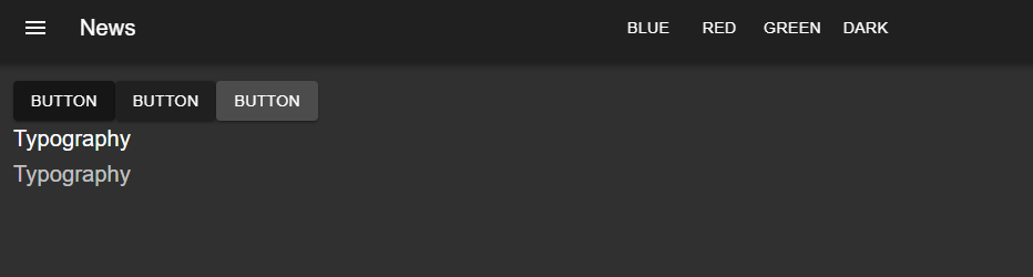 다음과 같이 상단 탭 우측의 BLUE, RED, GREEN, DARK 버튼을 클릭하여 웹 사이트의 전체적인 색 테마를 변경한다. 이를 구현하기 위해 Material-UI의 ThemeProvider, CreateMuiTheme, Palette를 이용하였다.