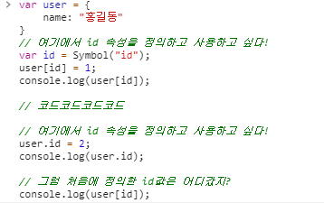 user라는 객체에 Symbol 타입의 값을 속성의 key값으로 설정하였고 속성의 값에 원하는 값을 할당했다. 이렇게 되면 1을 할당한 속성 값은 id라는 변수를 이용하지 않는 이상 변경할 수 없다.