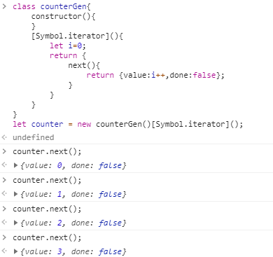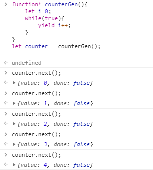 counterGen이라는 함수를 호출하면 iterator를 반환한다. 반환된 iterator는 generator 함수에서 yield 키워드에 도달할 때까지 코드를 실행하고 yield 키워드와 같이 위치한 변수를 value에 할당한다.