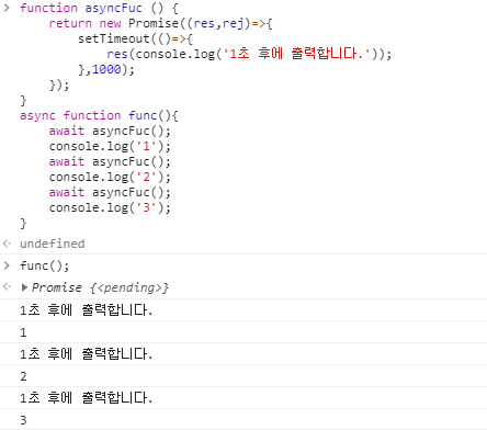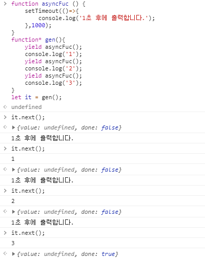 1초 후에 문자열을 출력하는 비동기 함수를 next 메서드를 호출하며 순차적으로 실행하였다. async, await을 사용하는 방식과 비교해보자.